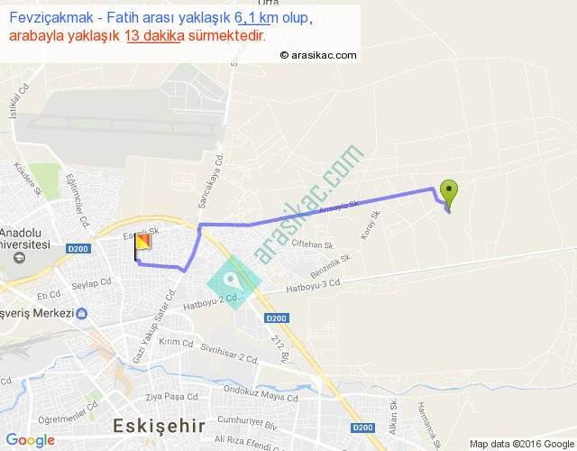 Fevziçakmak - Fatih arası yaklaşık olarak 90 km/h ile yukarıda belirtilen sürede olup, iki yerin kuş uçuşu uzaklığı (mesafesi) 5'dir. Yolculuk otobüsle 16 dakika sürmektedir.
