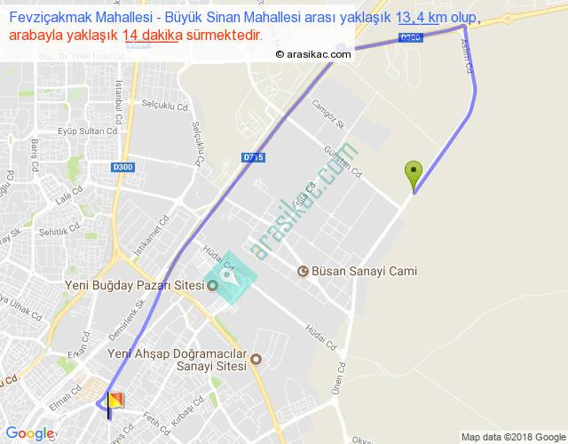 Fevziçakmak Mahallesi - Büyük Sinan Mahallesi arası yaklaşık olarak 90 km/h ile yukarıda belirtilen sürede olup, iki yerin kuş uçuşu uzaklığı (mesafesi) 6'dir. Yolculuk otobüsle 18 dakika sürmektedir.