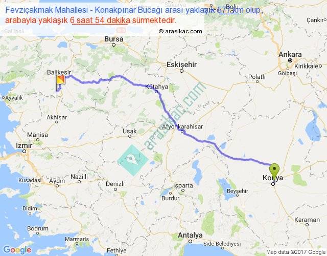 Fevziçakmak Mahallesi - Konakpınar Bucağı arası yaklaşık olarak 90 km/h ile yukarıda belirtilen sürede olup, iki yerin kuş uçuşu uzaklığı (mesafesi) 438'dir. Eğer belirtilen yerler arasında uçak seferi var ise bu süre uçakla 40 dakika'ya kadar düşebilir. Yolculuk otobüsle 8 saat 58 dakika sürmektedir.