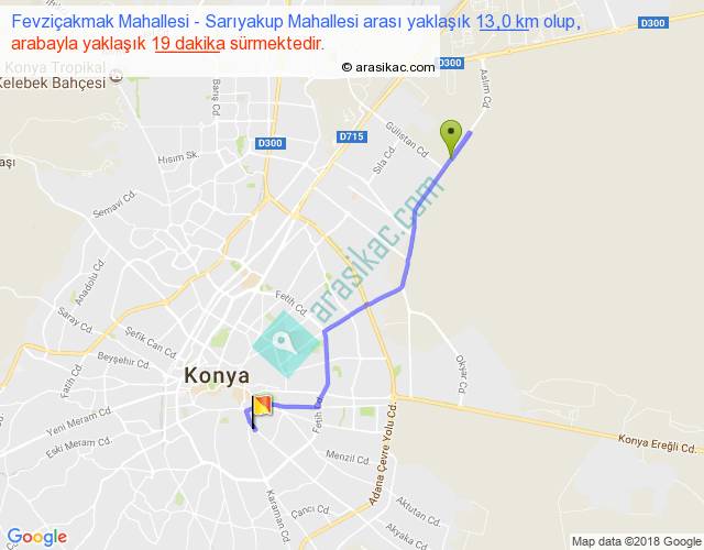 Fevziçakmak Mahallesi - Sarıyakup Mahallesi arası yaklaşık olarak 90 km/h ile yukarıda belirtilen sürede olup, iki yerin kuş uçuşu uzaklığı (mesafesi) 9'dir. Yolculuk otobüsle 24 dakika sürmektedir.
