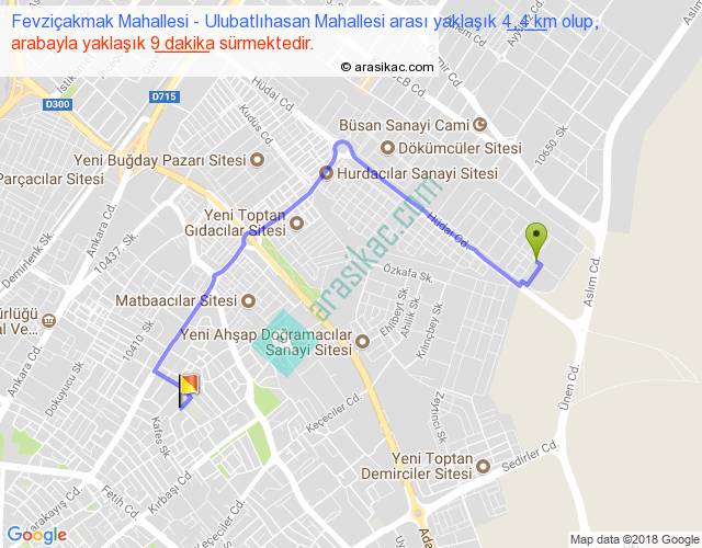 Fevziçakmak Mahallesi - Ulubatlıhasan Mahallesi arası yaklaşık olarak 90 km/h ile yukarıda belirtilen sürede olup, iki yerin kuş uçuşu uzaklığı (mesafesi) 5'dir. Yolculuk otobüsle 16 dakika sürmektedir.