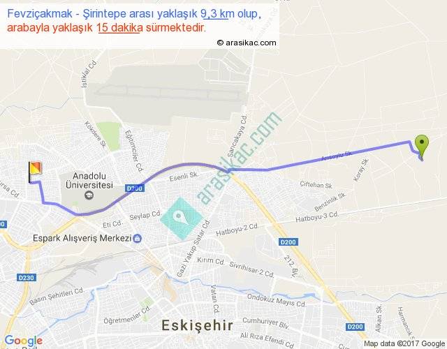 Fevziçakmak - Şirintepe arası yaklaşık olarak 90 km/h ile yukarıda belirtilen sürede olup, iki yerin kuş uçuşu uzaklığı (mesafesi) 8'dir. Yolculuk otobüsle 19 dakika sürmektedir.