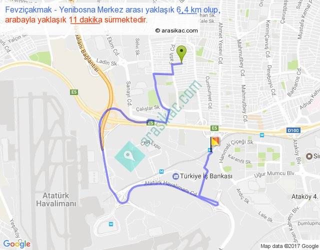 Fevziçakmak - Yenibosna Merkez arası yaklaşık olarak 90 km/h ile yukarıda belirtilen sürede olup, iki yerin kuş uçuşu uzaklığı (mesafesi) 1'dir. Yolculuk otobüsle 14 dakika sürmektedir.