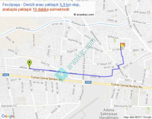 Fevzipaşa - Denizli arası yaklaşık olarak 90 km/h ile yukarıda belirtilen sürede olup, iki yerin kuş uçuşu uzaklığı (mesafesi) 3'dir. Yolculuk otobüsle 13 dakika sürmektedir.