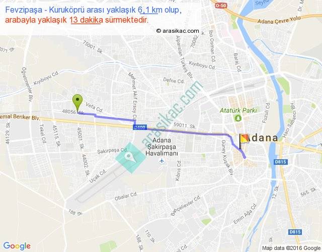 Fevzipaşa - Kuruköprü arası yaklaşık olarak 90 km/h ile yukarıda belirtilen sürede olup, iki yerin kuş uçuşu uzaklığı (mesafesi) 5'dir. Yolculuk otobüsle 16 dakika sürmektedir.