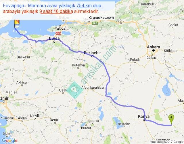 Fevzipaşa - Marmara arası yaklaşık olarak 90 km/h ile yukarıda belirtilen sürede olup, iki yerin kuş uçuşu uzaklığı (mesafesi) 602'dir. Eğer belirtilen yerler arasında uçak seferi var ise bu süre uçakla 55 dakika'ya kadar düşebilir. Yolculuk otobüsle 12 saat 2 dakika sürmektedir.