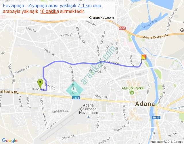 Fevzipaşa - Ziyapaşa arası yaklaşık olarak 90 km/h ile yukarıda belirtilen sürede olup, iki yerin kuş uçuşu uzaklığı (mesafesi) 6'dir. Yolculuk otobüsle 20 dakika sürmektedir.