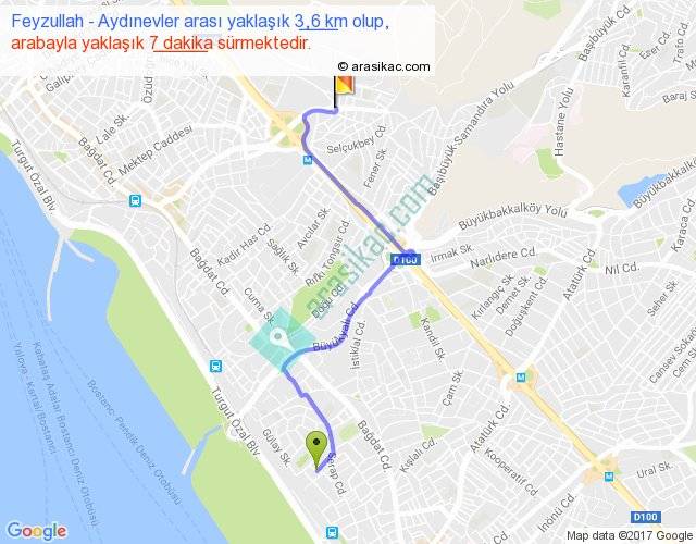 Feyzullah - Aydınevler arası yaklaşık olarak 90 km/h ile yukarıda belirtilen sürede olup, iki yerin kuş uçuşu uzaklığı (mesafesi) 2'dir. Yolculuk otobüsle 9 dakika sürmektedir.