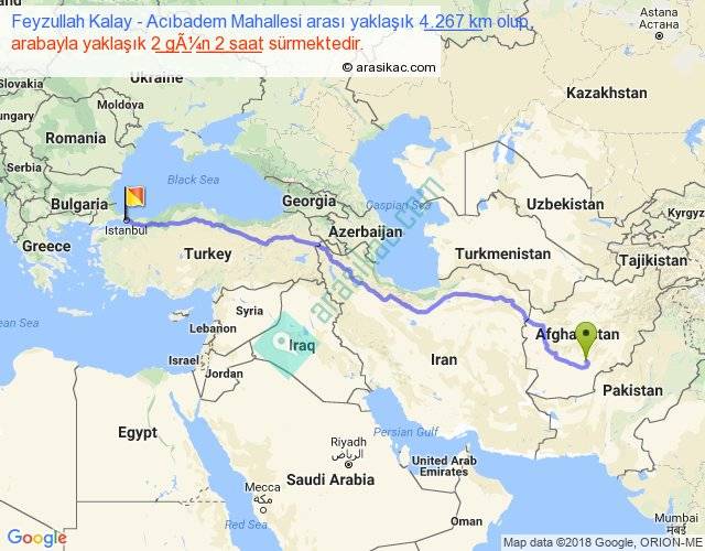 Feyzullah Kalay - Acıbadem Mahallesi arası yaklaşık olarak 90 km/h ile yukarıda belirtilen sürede olup, iki yerin kuş uçuşu uzaklığı (mesafesi) 3375'dir. Eğer belirtilen yerler arasında uçak seferi var ise bu süre uçakla 5 saat 11 dakika'ya kadar düşebilir. Yolculuk otobüsle 2 gün 17 saat sürmektedir.