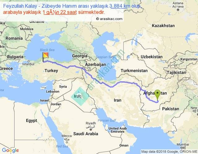 Feyzullah Kalay - Zübeyde Hanım arası yaklaşık olarak 90 km/h ile yukarıda belirtilen sürede olup, iki yerin kuş uçuşu uzaklığı (mesafesi) 3029'dir. Eğer belirtilen yerler arasında uçak seferi var ise bu süre uçakla 4 saat 39 dakika'ya kadar düşebilir. Yolculuk otobüsle 2 gün 11 saat sürmektedir.