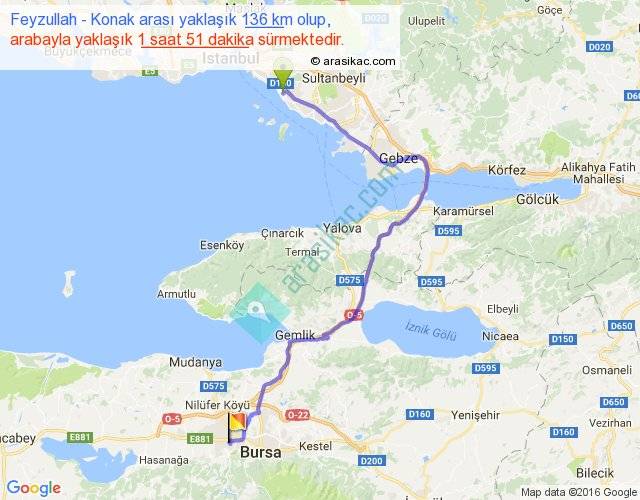 Feyzullah - Konak arası yaklaşık olarak 90 km/h ile yukarıda belirtilen sürede olup, iki yerin kuş uçuşu uzaklığı (mesafesi) 82'dir. Yolculuk otobüsle 2 saat 24 dakika sürmektedir.