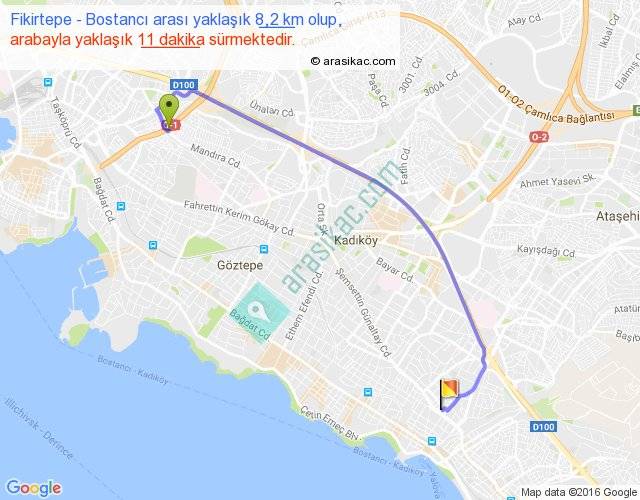 Fikirtepe - Bostancı arası yaklaşık olarak 90 km/h ile yukarıda belirtilen sürede olup, iki yerin kuş uçuşu uzaklığı (mesafesi) 6'dir. Yolculuk otobüsle 14 dakika sürmektedir.