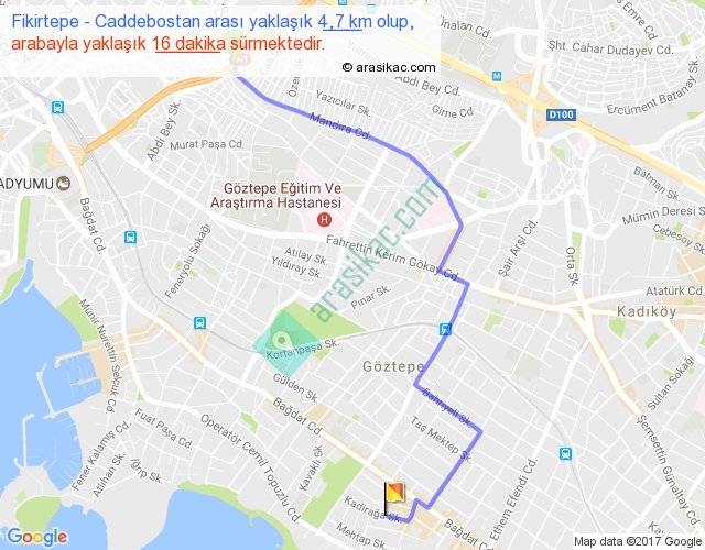 Fikirtepe - Caddebostan arası yaklaşık olarak 90 km/h ile yukarıda belirtilen sürede olup, iki yerin kuş uçuşu uzaklığı (mesafesi) 3'dir. Yolculuk otobüsle 20 dakika sürmektedir.