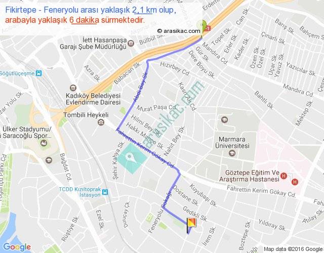 Fikirtepe - Feneryolu arası yaklaşık olarak 90 km/h ile yukarıda belirtilen sürede olup, iki yerin kuş uçuşu uzaklığı (mesafesi) 1'dir. Yolculuk otobüsle 7 dakika sürmektedir.