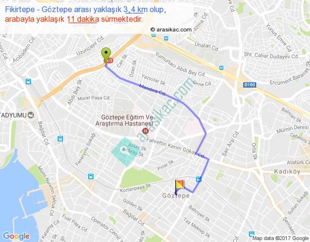 Fikirtepe - Göztepe arası yaklaşık olarak 90 km/h ile yukarıda belirtilen sürede olup, iki yerin kuş uçuşu uzaklığı (mesafesi) 2'dir. Yolculuk otobüsle 14 dakika sürmektedir.
