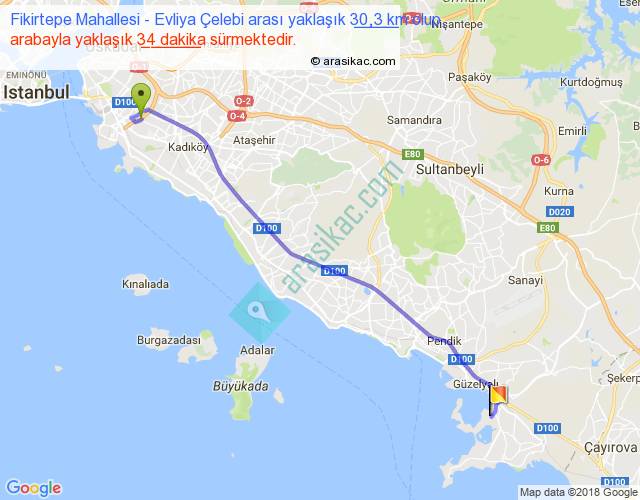 Fikirtepe Mahallesi - Evliya Çelebi arası yaklaşık olarak 90 km/h ile yukarıda belirtilen sürede olup, iki yerin kuş uçuşu uzaklığı (mesafesi) 26'dir. Yolculuk otobüsle 44 dakika sürmektedir.