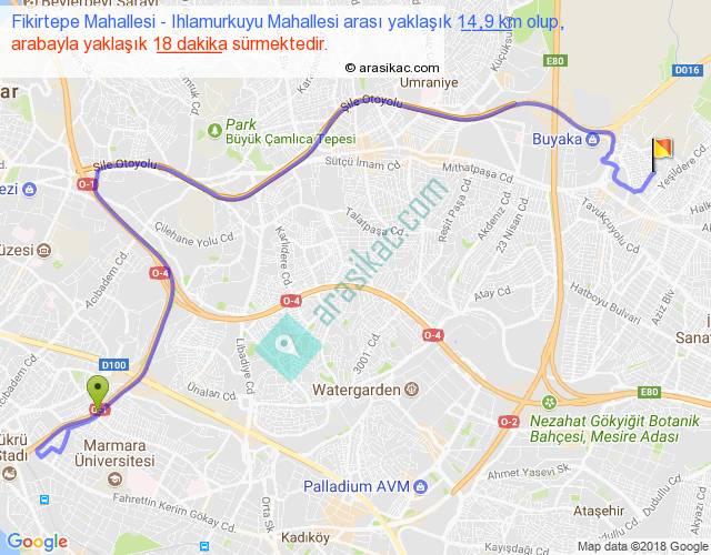 Fikirtepe Mahallesi - Ihlamurkuyu Mahallesi arası yaklaşık olarak 90 km/h ile yukarıda belirtilen sürede olup, iki yerin kuş uçuşu uzaklığı (mesafesi) 8'dir. Yolculuk otobüsle 23 dakika sürmektedir.