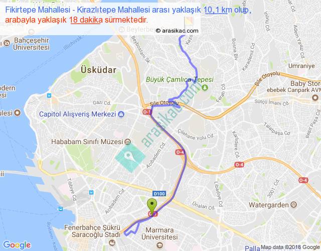 Fikirtepe Mahallesi - Kirazlıtepe Mahallesi arası yaklaşık olarak 90 km/h ile yukarıda belirtilen sürede olup, iki yerin kuş uçuşu uzaklığı (mesafesi) 5'dir. Yolculuk otobüsle 23 dakika sürmektedir.