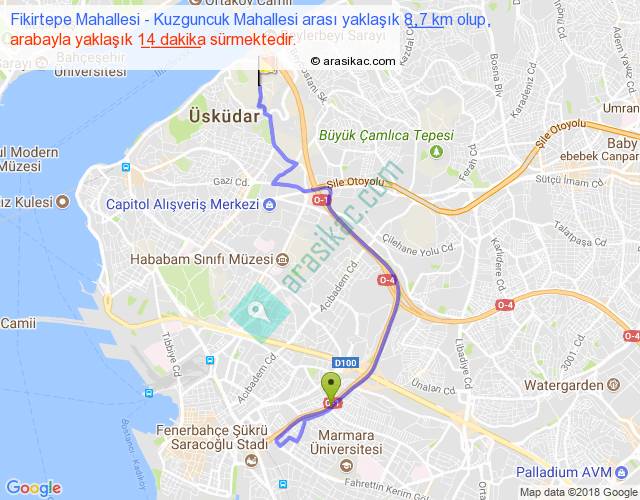 Fikirtepe Mahallesi - Kuzguncuk Mahallesi arası yaklaşık olarak 90 km/h ile yukarıda belirtilen sürede olup, iki yerin kuş uçuşu uzaklığı (mesafesi) 5'dir. Yolculuk otobüsle 18 dakika sürmektedir.