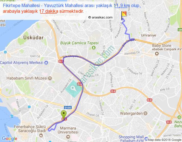 Fikirtepe Mahallesi - Yavuztürk Mahallesi arası yaklaşık olarak 90 km/h ile yukarıda belirtilen sürede olup, iki yerin kuş uçuşu uzaklığı (mesafesi) 6'dir. Yolculuk otobüsle 22 dakika sürmektedir.