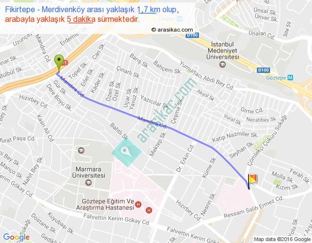 Fikirtepe - Merdivenköy arası yaklaşık olarak 90 km/h ile yukarıda belirtilen sürede olup, iki yerin kuş uçuşu uzaklığı (mesafesi) 2'dir. Yolculuk otobüsle 6 dakika sürmektedir.
