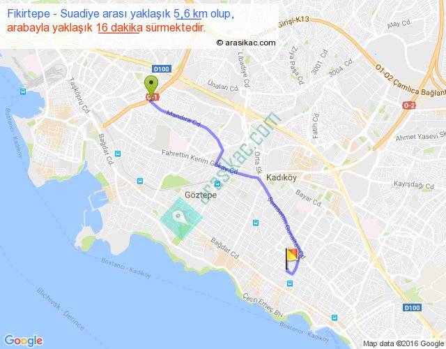 Fikirtepe - Suadiye arası yaklaşık olarak 90 km/h ile yukarıda belirtilen sürede olup, iki yerin kuş uçuşu uzaklığı (mesafesi) 4'dir. Yolculuk otobüsle 20 dakika sürmektedir.