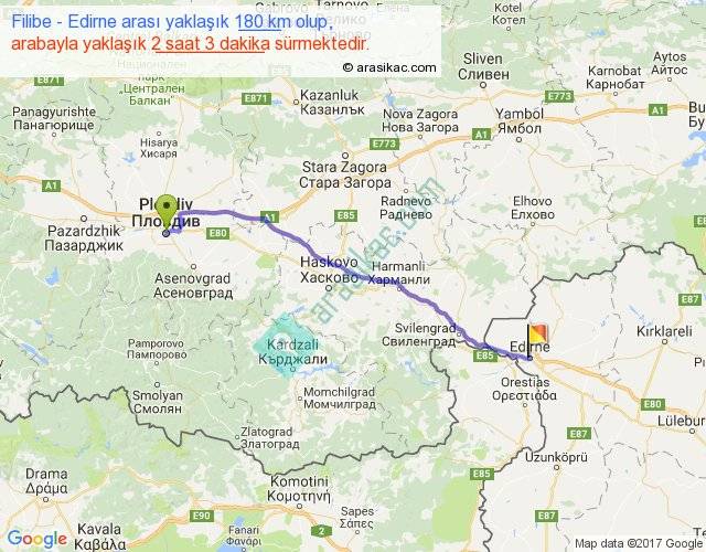 Filibe - Edirne arası yaklaşık olarak 90 km/h ile yukarıda belirtilen sürede olup, iki yerin kuş uçuşu uzaklığı (mesafesi) 157'dir. Yolculuk otobüsle 2 saat 39 dakika sürmektedir.