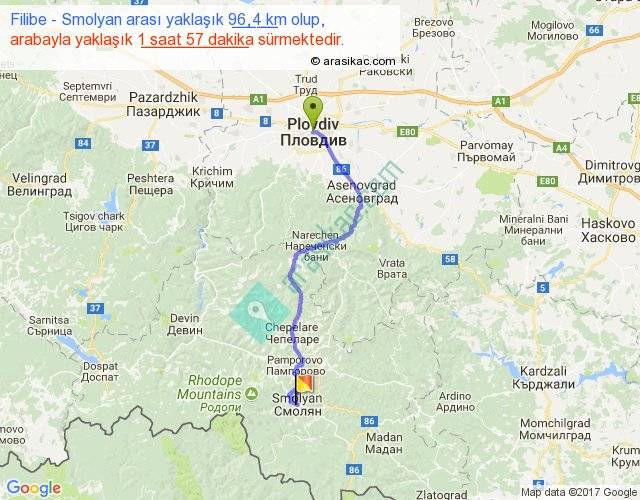 Filibe - Smolyan arası yaklaşık olarak 90 km/h ile yukarıda belirtilen sürede olup, iki yerin kuş uçuşu uzaklığı (mesafesi) 62'dir. Yolculuk otobüsle 2 saat 32 dakika sürmektedir.