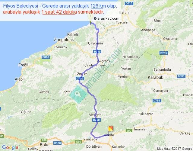 Filyos Belediyesi - Gerede arası yaklaşık olarak 90 km/h ile yukarıda belirtilen sürede olup, iki yerin kuş uçuşu uzaklığı (mesafesi) 85'dir. Yolculuk otobüsle 2 saat 12 dakika sürmektedir.