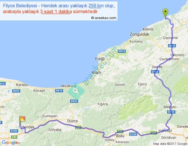 Filyos Belediyesi - Hendek arası yaklaşık olarak 90 km/h ile yukarıda belirtilen sürede olup, iki yerin kuş uçuşu uzaklığı (mesafesi) 140'dir. Yolculuk otobüsle 3 saat 55 dakika sürmektedir.