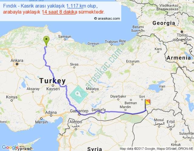 Fındık - Kasrik arası yaklaşık olarak 90 km/h ile yukarıda belirtilen sürede olup, iki yerin kuş uçuşu uzaklığı (mesafesi) 725'dir. Eğer belirtilen yerler arasında uçak seferi var ise bu süre uçakla 1 saat 06 dakika'ya kadar düşebilir. Yolculuk otobüsle 18 saat 22 dakika sürmektedir.