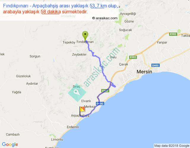 Fındıkpınarı - Arpaçbahşiş arası yaklaşık olarak 90 km/h ile yukarıda belirtilen sürede olup, iki yerin kuş uçuşu uzaklığı (mesafesi) 30'dir. Yolculuk otobüsle 1 saat 15 dakika sürmektedir.