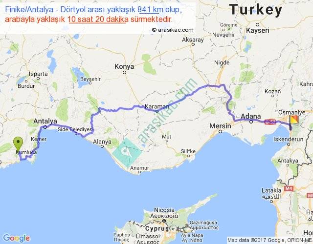Finike Antalya - Dörtyol arası yaklaşık olarak 90 km/h ile yukarıda belirtilen sürede olup, iki yerin kuş uçuşu uzaklığı (mesafesi) 545'dir. Eğer belirtilen yerler arasında uçak seferi var ise bu süre uçakla 50 dakika'ya kadar düşebilir. Yolculuk otobüsle 13 saat 26 dakika sürmektedir.