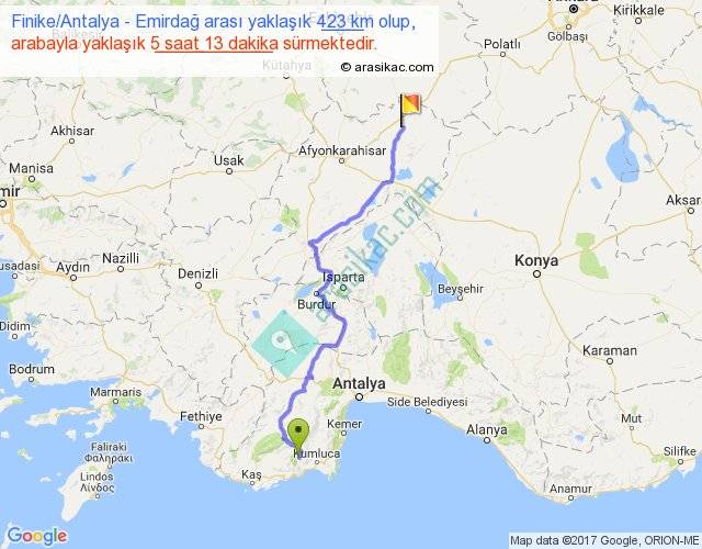 Finike Antalya - Emirdağ arası yaklaşık olarak 90 km/h ile yukarıda belirtilen sürede olup, iki yerin kuş uçuşu uzaklığı (mesafesi) 303'dir. Eğer belirtilen yerler arasında uçak seferi var ise bu süre uçakla 27 dakika'ya kadar düşebilir. Yolculuk otobüsle 6 saat 46 dakika sürmektedir.