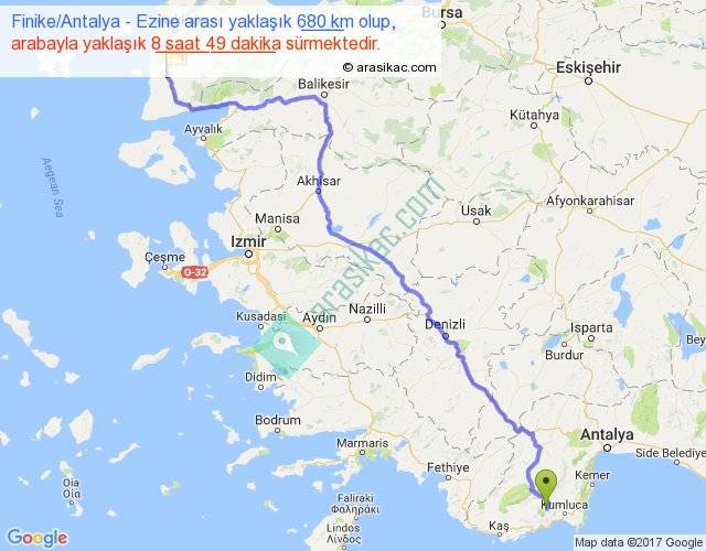 Finike Antalya - Ezine arası yaklaşık olarak 90 km/h ile yukarıda belirtilen sürede olup, iki yerin kuş uçuşu uzaklığı (mesafesi) 497'dir. Eğer belirtilen yerler arasında uçak seferi var ise bu süre uçakla 45 dakika'ya kadar düşebilir. Yolculuk otobüsle 11 saat 27 dakika sürmektedir.