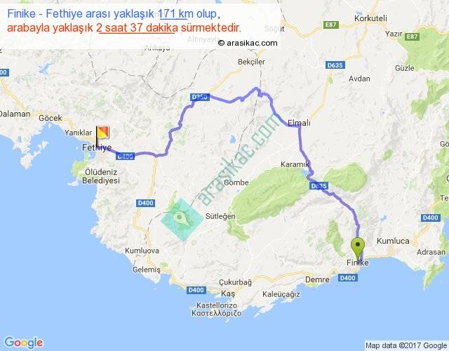 Finike - Fethiye arası yaklaşık olarak 90 km/h ile yukarıda belirtilen sürede olup, iki yerin kuş uçuşu uzaklığı (mesafesi) 99'dir. Yolculuk otobüsle 3 saat 24 dakika sürmektedir.