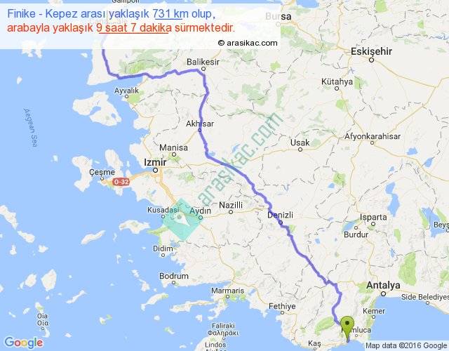 Finike - Kepez arası yaklaşık olarak 90 km/h ile yukarıda belirtilen sürede olup, iki yerin kuş uçuşu uzaklığı (mesafesi) 532'dir. Eğer belirtilen yerler arasında uçak seferi var ise bu süre uçakla 49 dakika'ya kadar düşebilir. Yolculuk otobüsle 11 saat 51 dakika sürmektedir.