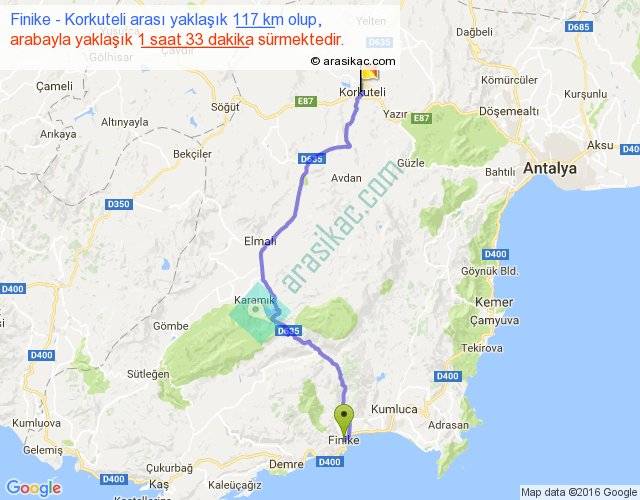 Finike - Korkuteli arası yaklaşık olarak 90 km/h ile yukarıda belirtilen sürede olup, iki yerin kuş uçuşu uzaklığı (mesafesi) 85'dir. Yolculuk otobüsle 2 saat 0 dakika sürmektedir.