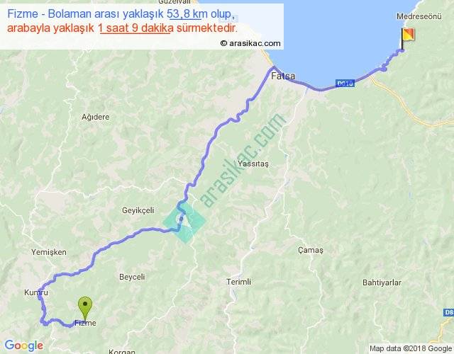 Fizme - Bolaman arası yaklaşık olarak 90 km/h ile yukarıda belirtilen sürede olup, iki yerin kuş uçuşu uzaklığı (mesafesi) 34'dir. Yolculuk otobüsle 1 saat 29 dakika sürmektedir.