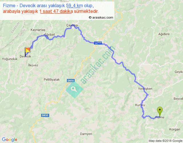Fizme - Devecik arası yaklaşık olarak 90 km/h ile yukarıda belirtilen sürede olup, iki yerin kuş uçuşu uzaklığı (mesafesi) 30'dir. Yolculuk otobüsle 2 saat 19 dakika sürmektedir.