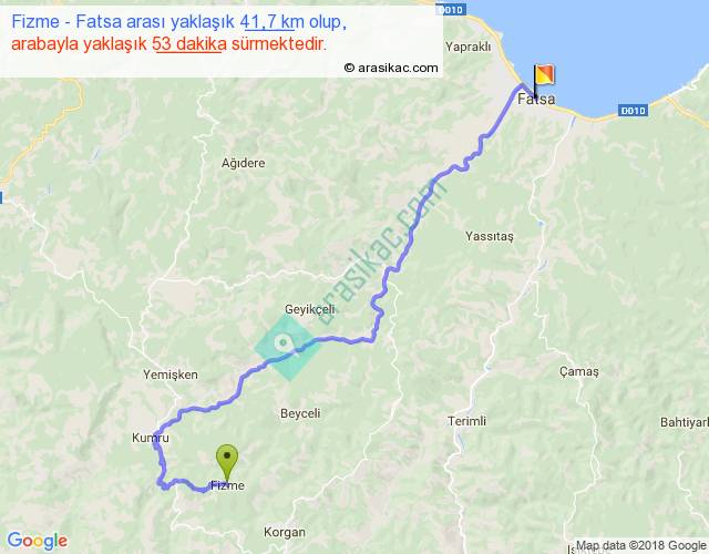 Fizme - Fatsa arası yaklaşık olarak 90 km/h ile yukarıda belirtilen sürede olup, iki yerin kuş uçuşu uzaklığı (mesafesi) 26'dir. Yolculuk otobüsle 1 saat 8 dakika sürmektedir.