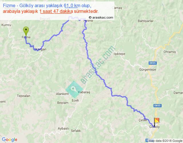 Fizme - Gölköy arası yaklaşık olarak 90 km/h ile yukarıda belirtilen sürede olup, iki yerin kuş uçuşu uzaklığı (mesafesi) 31'dir. Yolculuk otobüsle 2 saat 19 dakika sürmektedir.