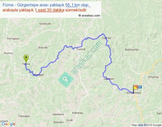 Fizme - Gürgentepe arası yaklaşık olarak 90 km/h ile yukarıda belirtilen sürede olup, iki yerin kuş uçuşu uzaklığı (mesafesi) 25'dir. Yolculuk otobüsle 1 saat 57 dakika sürmektedir.
