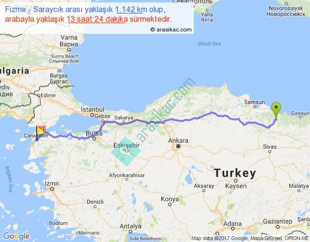 Fizme - Saraycık arası yaklaşık olarak 90 km/h ile yukarıda belirtilen sürede olup, iki yerin kuş uçuşu uzaklığı (mesafesi) 913'dir. Eğer belirtilen yerler arasında uçak seferi var ise bu süre uçakla 1 saat 24 dakika'ya kadar düşebilir. Yolculuk otobüsle 17 saat 25 dakika sürmektedir.
