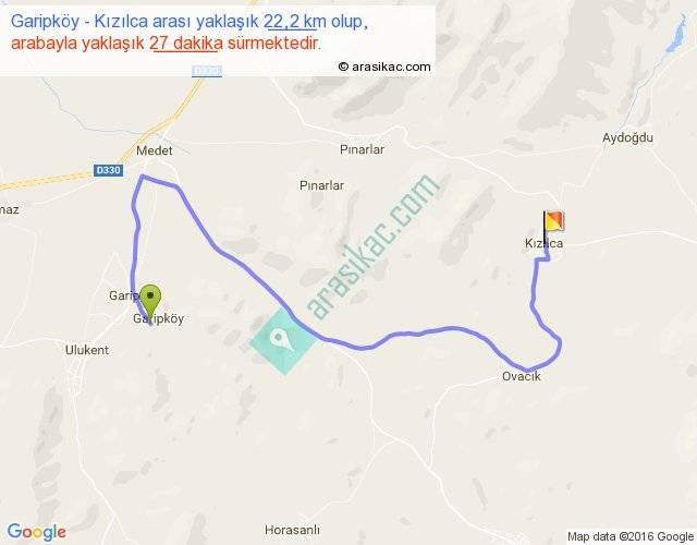 Garipköy - Kızılca arası yaklaşık olarak 90 km/h ile yukarıda belirtilen sürede olup, iki yerin kuş uçuşu uzaklığı (mesafesi) 11'dir. Yolculuk otobüsle 35 dakika sürmektedir.