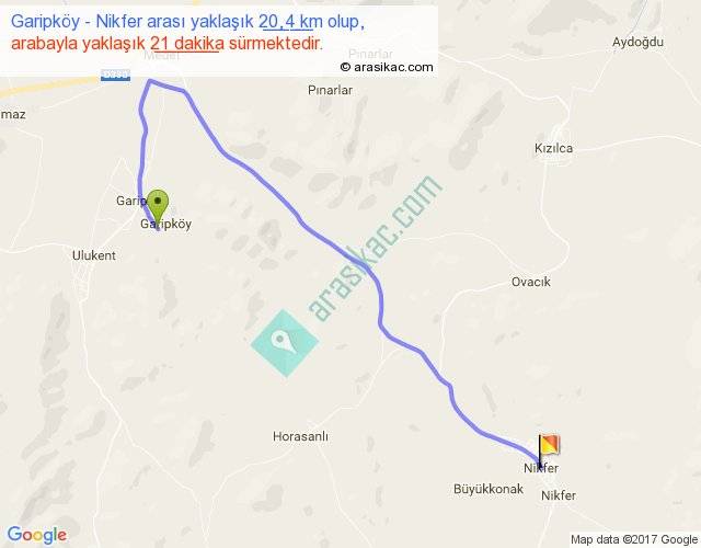 Garipköy - Nikfer arası yaklaşık olarak 90 km/h ile yukarıda belirtilen sürede olup, iki yerin kuş uçuşu uzaklığı (mesafesi) 12'dir. Yolculuk otobüsle 27 dakika sürmektedir.