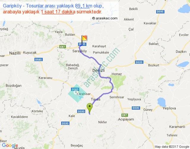 Garipköy - Tosunlar arası yaklaşık olarak 90 km/h ile yukarıda belirtilen sürede olup, iki yerin kuş uçuşu uzaklığı (mesafesi) 56'dir. Yolculuk otobüsle 1 saat 40 dakika sürmektedir.