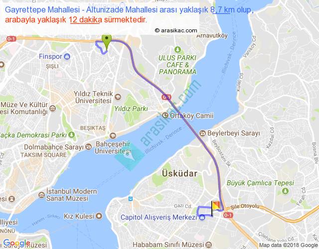 Gayrettepe Mahallesi - Altunizade Mahallesi arası yaklaşık olarak 90 km/h ile yukarıda belirtilen sürede olup, iki yerin kuş uçuşu uzaklığı (mesafesi) 6'dir. Yolculuk otobüsle 15 dakika sürmektedir.