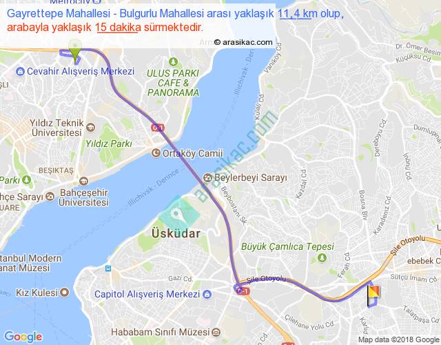 Gayrettepe Mahallesi - Bulgurlu Mahallesi arası yaklaşık olarak 90 km/h ile yukarıda belirtilen sürede olup, iki yerin kuş uçuşu uzaklığı (mesafesi) 8'dir. Yolculuk otobüsle 19 dakika sürmektedir.