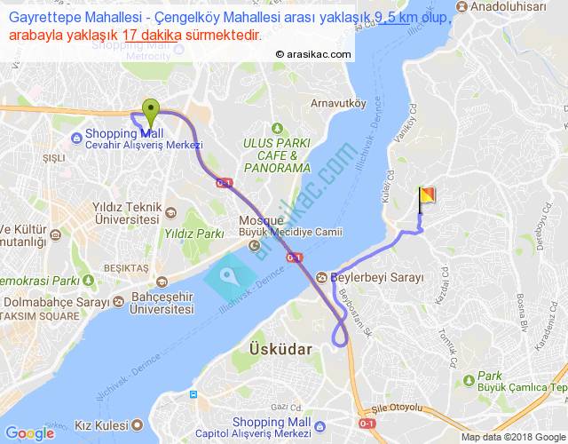 Gayrettepe Mahallesi - Çengelköy Mahallesi arası yaklaşık olarak 90 km/h ile yukarıda belirtilen sürede olup, iki yerin kuş uçuşu uzaklığı (mesafesi) 5'dir. Yolculuk otobüsle 22 dakika sürmektedir.